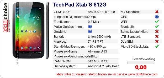 Daten des Mobiltelefons TechPad Xtab S 812G auf Ihrer Seite