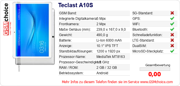 Hast du eigene Webseite? Willst du die Informationen über Standarddaten des Handys Teclast A10S irgendwo veröffentlichen? Das ist sehr einfach. Du kannst das Bild herunterladen oder kopieren und auf der Webseite folgenden Code hinzufügen:Das Einfügen von diesem Code verursacht das Anzeigen von dem folgenden Bild: