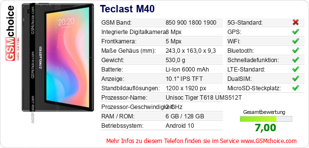 Hast du eigene Webseite? Willst du die Informationen über Standarddaten des Handys Teclast M40 irgendwo veröffentlichen? Das ist sehr einfach. Du kannst das Bild herunterladen oder kopieren und auf der Webseite folgenden Code hinzufügen:Das Einfügen von diesem Code verursacht das Anzeigen von dem folgenden Bild:
