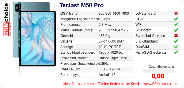 Hast du eigene Webseite? Willst du die Informationen über Standarddaten des Handys Teclast M50 Pro irgendwo veröffentlichen? Das ist sehr einfach. Du kannst das Bild herunterladen oder kopieren und auf der Webseite folgenden Code hinzufügen:Das Einfügen von diesem Code verursacht das Anzeigen von dem folgenden Bild: