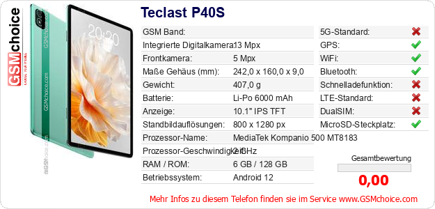 Hast du eigene Webseite? Willst du die Informationen über Standarddaten des Handys Teclast P40S irgendwo veröffentlichen? Das ist sehr einfach. Du kannst das Bild herunterladen oder kopieren und auf der Webseite folgenden Code hinzufügen:Das Einfügen von diesem Code verursacht das Anzeigen von dem folgenden Bild: