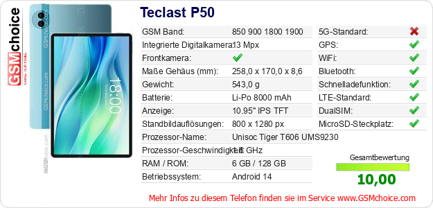 Hast du eigene Webseite? Willst du die Informationen über Standarddaten des Handys Teclast P50 irgendwo veröffentlichen? Das ist sehr einfach. Du kannst das Bild herunterladen oder kopieren und auf der Webseite folgenden Code hinzufügen:Das Einfügen von diesem Code verursacht das Anzeigen von dem folgenden Bild: