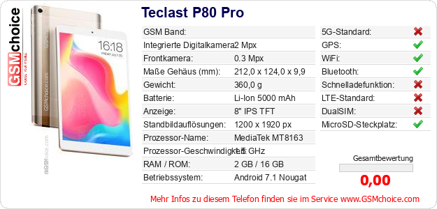 Hast du eigene Webseite? Willst du die Informationen über Standarddaten des Handys Teclast P80 Pro irgendwo veröffentlichen? Das ist sehr einfach. Du kannst das Bild herunterladen oder kopieren und auf der Webseite folgenden Code hinzufügen:Das Einfügen von diesem Code verursacht das Anzeigen von dem folgenden Bild: