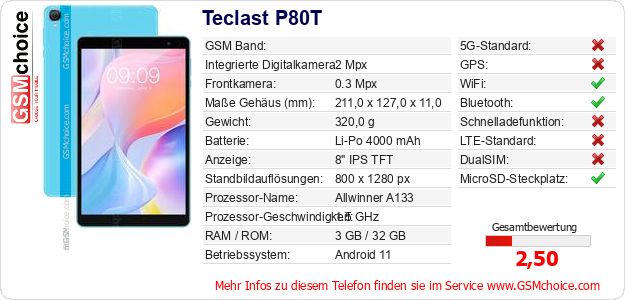 Hast du eigene Webseite? Willst du die Informationen über Standarddaten des Handys Teclast P80T irgendwo veröffentlichen? Das ist sehr einfach. Du kannst das Bild herunterladen oder kopieren und auf der Webseite folgenden Code hinzufügen:Das Einfügen von diesem Code verursacht das Anzeigen von dem folgenden Bild: