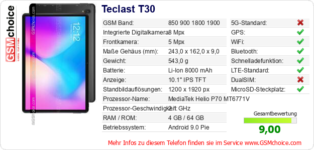 Hast du eigene Webseite? Willst du die Informationen über Standarddaten des Handys Teclast T30 irgendwo veröffentlichen? Das ist sehr einfach. Du kannst das Bild herunterladen oder kopieren und auf der Webseite folgenden Code hinzufügen:Das Einfügen von diesem Code verursacht das Anzeigen von dem folgenden Bild: