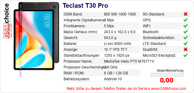 Hast du eigene Webseite? Willst du die Informationen über Standarddaten des Handys Teclast T30 Pro irgendwo veröffentlichen? Das ist sehr einfach. Du kannst das Bild herunterladen oder kopieren und auf der Webseite folgenden Code hinzufügen:Das Einfügen von diesem Code verursacht das Anzeigen von dem folgenden Bild: