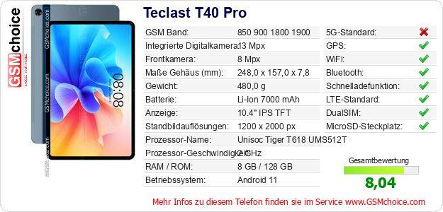 Hast du eigene Webseite? Willst du die Informationen über Standarddaten des Handys Teclast T40 Pro irgendwo veröffentlichen? Das ist sehr einfach. Du kannst das Bild herunterladen oder kopieren und auf der Webseite folgenden Code hinzufügen:Das Einfügen von diesem Code verursacht das Anzeigen von dem folgenden Bild:
