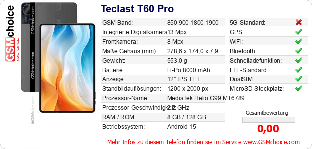 Hast du eigene Webseite? Willst du die Informationen über Standarddaten des Handys Teclast T60 Pro irgendwo veröffentlichen? Das ist sehr einfach. Du kannst das Bild herunterladen oder kopieren und auf der Webseite folgenden Code hinzufügen:Das Einfügen von diesem Code verursacht das Anzeigen von dem folgenden Bild:
