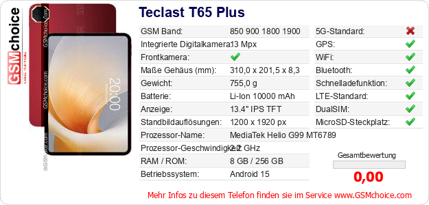 Hast du eigene Webseite? Willst du die Informationen über Standarddaten des Handys Teclast T65 Plus irgendwo veröffentlichen? Das ist sehr einfach. Du kannst das Bild herunterladen oder kopieren und auf der Webseite folgenden Code hinzufügen:Das Einfügen von diesem Code verursacht das Anzeigen von dem folgenden Bild: