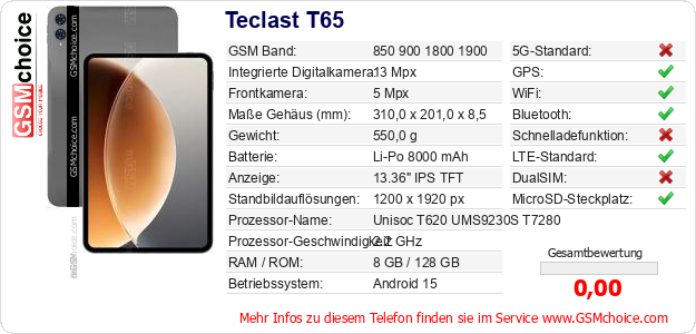 Hast du eigene Webseite? Willst du die Informationen über Standarddaten des Handys Teclast T65 irgendwo veröffentlichen? Das ist sehr einfach. Du kannst das Bild herunterladen oder kopieren und auf der Webseite folgenden Code hinzufügen:Das Einfügen von diesem Code verursacht das Anzeigen von dem folgenden Bild: