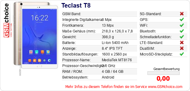 Hast du eigene Webseite? Willst du die Informationen über Standarddaten des Handys Teclast T8 irgendwo veröffentlichen? Das ist sehr einfach. Du kannst das Bild herunterladen oder kopieren und auf der Webseite folgenden Code hinzufügen:Das Einfügen von diesem Code verursacht das Anzeigen von dem folgenden Bild: