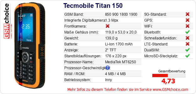 Daten des Mobiltelefons Tecmobile Titan 150 auf Ihrer Seite