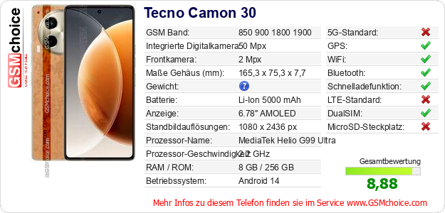 Hast du eigene Webseite? Willst du die Informationen über Standarddaten des Handys Tecno Camon 30 irgendwo veröffentlichen? Das ist sehr einfach. Du kannst das Bild herunterladen oder kopieren und auf der Webseite folgenden Code hinzufügen:Das Einfügen von diesem Code verursacht das Anzeigen von dem folgenden Bild: