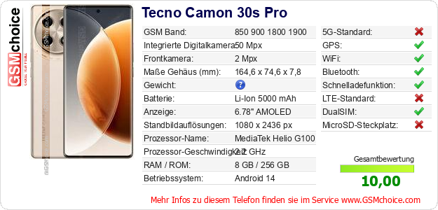 Hast du eigene Webseite? Willst du die Informationen über Standarddaten des Handys Tecno Camon 30s Pro irgendwo veröffentlichen? Das ist sehr einfach. Du kannst das Bild herunterladen oder kopieren und auf der Webseite folgenden Code hinzufügen:Das Einfügen von diesem Code verursacht das Anzeigen von dem folgenden Bild: