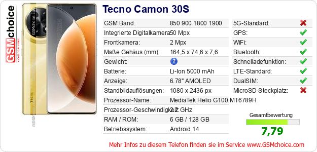 Hast du eigene Webseite? Willst du die Informationen über Standarddaten des Handys Tecno Camon 30S irgendwo veröffentlichen? Das ist sehr einfach. Du kannst das Bild herunterladen oder kopieren und auf der Webseite folgenden Code hinzufügen:Das Einfügen von diesem Code verursacht das Anzeigen von dem folgenden Bild: