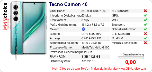 Hast du eigene Webseite? Willst du die Informationen über Standarddaten des Handys Tecno Camon 40 irgendwo veröffentlichen? Das ist sehr einfach. Du kannst das Bild herunterladen oder kopieren und auf der Webseite folgenden Code hinzufügen:Das Einfügen von diesem Code verursacht das Anzeigen von dem folgenden Bild: