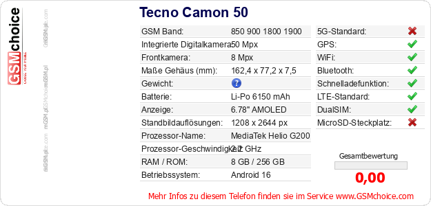 Hast du eigene Webseite? Willst du die Informationen über Standarddaten des Handys Tecno Camon 50 irgendwo veröffentlichen? Das ist sehr einfach. Du kannst das Bild herunterladen oder kopieren und auf der Webseite folgenden Code hinzufügen:Das Einfügen von diesem Code verursacht das Anzeigen von dem folgenden Bild: