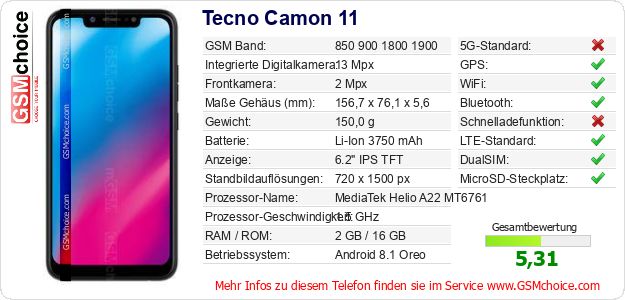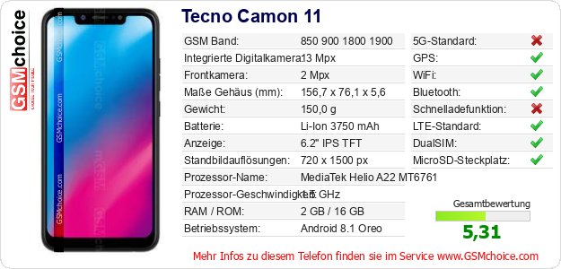 Hast du eigene Webseite? Willst du die Informationen über Standarddaten des Handys Tecno Camon 11 irgendwo veröffentlichen? Das ist sehr einfach. Du kannst das Bild herunterladen oder kopieren und auf der Webseite folgenden Code hinzufügen:Das Einfügen von diesem Code verursacht das Anzeigen von dem folgenden Bild: