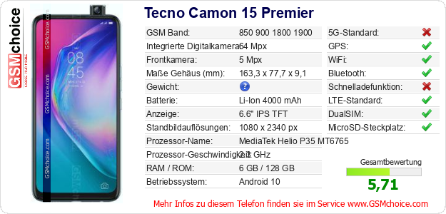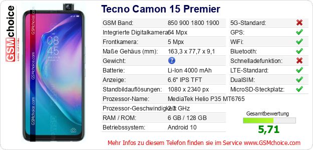 Hast du eigene Webseite? Willst du die Informationen über Standarddaten des Handys Tecno Camon 15 Premier irgendwo veröffentlichen? Das ist sehr einfach. Du kannst das Bild herunterladen oder kopieren und auf der Webseite folgenden Code hinzufügen:Das Einfügen von diesem Code verursacht das Anzeigen von dem folgenden Bild:
