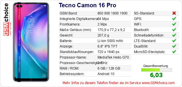 Hast du eigene Webseite? Willst du die Informationen über Standarddaten des Handys Tecno Camon 16 Pro irgendwo veröffentlichen? Das ist sehr einfach. Du kannst das Bild herunterladen oder kopieren und auf der Webseite folgenden Code hinzufügen:Das Einfügen von diesem Code verursacht das Anzeigen von dem folgenden Bild: