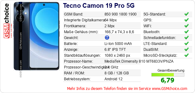 Hast du eigene Webseite? Willst du die Informationen über Standarddaten des Handys Tecno Camon 19 Pro 5G irgendwo veröffentlichen? Das ist sehr einfach. Du kannst das Bild herunterladen oder kopieren und auf der Webseite folgenden Code hinzufügen:Das Einfügen von diesem Code verursacht das Anzeigen von dem folgenden Bild: