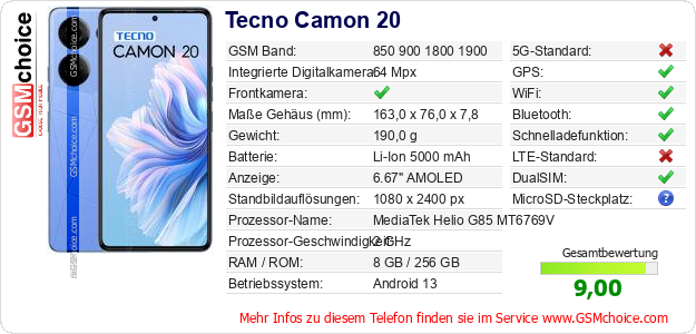 Hast du eigene Webseite? Willst du die Informationen über Standarddaten des Handys Tecno Camon 20 irgendwo veröffentlichen? Das ist sehr einfach. Du kannst das Bild herunterladen oder kopieren und auf der Webseite folgenden Code hinzufügen:Das Einfügen von diesem Code verursacht das Anzeigen von dem folgenden Bild: