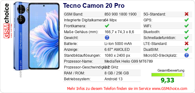 Hast du eigene Webseite? Willst du die Informationen über Standarddaten des Handys Tecno Camon 20 Pro irgendwo veröffentlichen? Das ist sehr einfach. Du kannst das Bild herunterladen oder kopieren und auf der Webseite folgenden Code hinzufügen:Das Einfügen von diesem Code verursacht das Anzeigen von dem folgenden Bild: