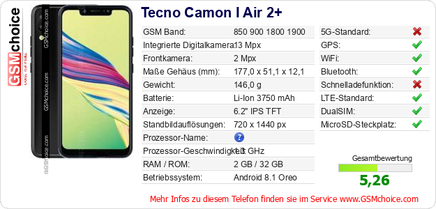 Hast du eigene Webseite? Willst du die Informationen über Standarddaten des Handys Tecno Camon I Air 2+ irgendwo veröffentlichen? Das ist sehr einfach. Du kannst das Bild herunterladen oder kopieren und auf der Webseite folgenden Code hinzufügen:Das Einfügen von diesem Code verursacht das Anzeigen von dem folgenden Bild: