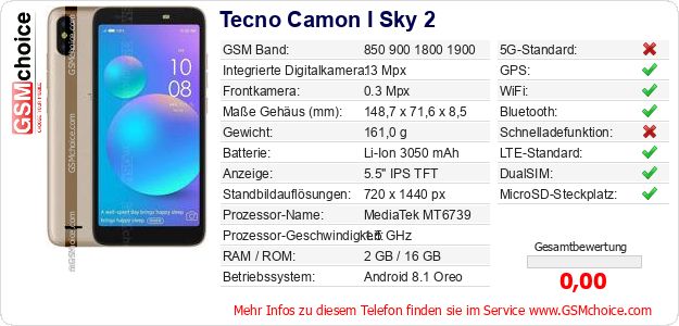 Hast du eigene Webseite? Willst du die Informationen über Standarddaten des Handys Tecno Camon I Sky 2 irgendwo veröffentlichen? Das ist sehr einfach. Du kannst das Bild herunterladen oder kopieren und auf der Webseite folgenden Code hinzufügen:Das Einfügen von diesem Code verursacht das Anzeigen von dem folgenden Bild: