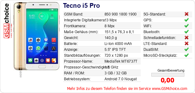 Hast du eigene Webseite? Willst du die Informationen über Standarddaten des Handys Tecno i5 Pro irgendwo veröffentlichen? Das ist sehr einfach. Du kannst das Bild herunterladen oder kopieren und auf der Webseite folgenden Code hinzufügen:Das Einfügen von diesem Code verursacht das Anzeigen von dem folgenden Bild: