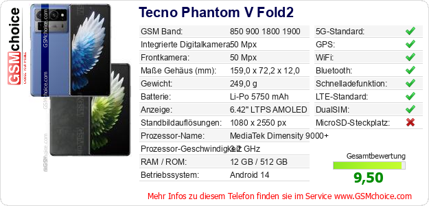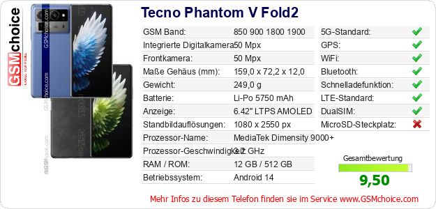 Hast du eigene Webseite? Willst du die Informationen über Standarddaten des Handys Tecno Phantom V Fold2 irgendwo veröffentlichen? Das ist sehr einfach. Du kannst das Bild herunterladen oder kopieren und auf der Webseite folgenden Code hinzufügen:Das Einfügen von diesem Code verursacht das Anzeigen von dem folgenden Bild: