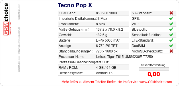 Hast du eigene Webseite? Willst du die Informationen über Standarddaten des Handys Tecno Pop X irgendwo veröffentlichen? Das ist sehr einfach. Du kannst das Bild herunterladen oder kopieren und auf der Webseite folgenden Code hinzufügen:Das Einfügen von diesem Code verursacht das Anzeigen von dem folgenden Bild: