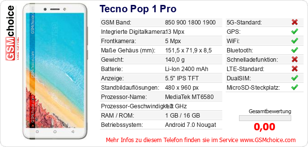 Hast du eigene Webseite? Willst du die Informationen über Standarddaten des Handys Tecno Pop 1 Pro irgendwo veröffentlichen? Das ist sehr einfach. Du kannst das Bild herunterladen oder kopieren und auf der Webseite folgenden Code hinzufügen:Das Einfügen von diesem Code verursacht das Anzeigen von dem folgenden Bild: