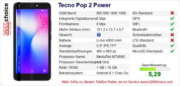 Hast du eigene Webseite? Willst du die Informationen über Standarddaten des Handys Tecno Pop 2 Power irgendwo veröffentlichen? Das ist sehr einfach. Du kannst das Bild herunterladen oder kopieren und auf der Webseite folgenden Code hinzufügen:Das Einfügen von diesem Code verursacht das Anzeigen von dem folgenden Bild: