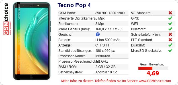 Hast du eigene Webseite? Willst du die Informationen über Standarddaten des Handys Tecno Pop 4 irgendwo veröffentlichen? Das ist sehr einfach. Du kannst das Bild herunterladen oder kopieren und auf der Webseite folgenden Code hinzufügen:Das Einfügen von diesem Code verursacht das Anzeigen von dem folgenden Bild: