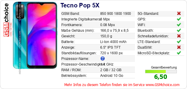 Hast du eigene Webseite? Willst du die Informationen über Standarddaten des Handys Tecno Pop 5X irgendwo veröffentlichen? Das ist sehr einfach. Du kannst das Bild herunterladen oder kopieren und auf der Webseite folgenden Code hinzufügen:Das Einfügen von diesem Code verursacht das Anzeigen von dem folgenden Bild: