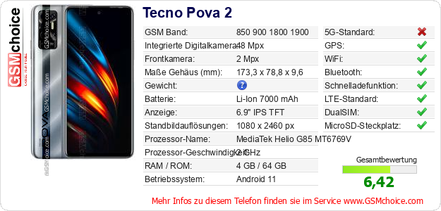 Hast du eigene Webseite? Willst du die Informationen über Standarddaten des Handys Tecno Pova 2 irgendwo veröffentlichen? Das ist sehr einfach. Du kannst das Bild herunterladen oder kopieren und auf der Webseite folgenden Code hinzufügen:Das Einfügen von diesem Code verursacht das Anzeigen von dem folgenden Bild: