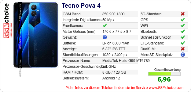 Hast du eigene Webseite? Willst du die Informationen über Standarddaten des Handys Tecno Pova 4 irgendwo veröffentlichen? Das ist sehr einfach. Du kannst das Bild herunterladen oder kopieren und auf der Webseite folgenden Code hinzufügen:Das Einfügen von diesem Code verursacht das Anzeigen von dem folgenden Bild:
