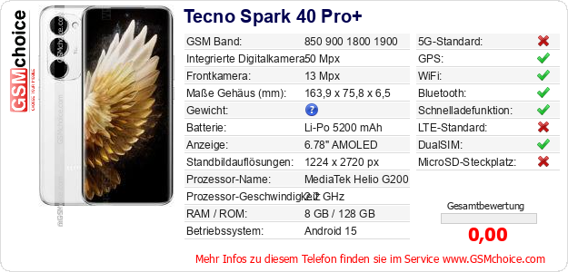 Hast du eigene Webseite? Willst du die Informationen über Standarddaten des Handys Tecno Spark 40 Pro+ irgendwo veröffentlichen? Das ist sehr einfach. Du kannst das Bild herunterladen oder kopieren und auf der Webseite folgenden Code hinzufügen:Das Einfügen von diesem Code verursacht das Anzeigen von dem folgenden Bild: