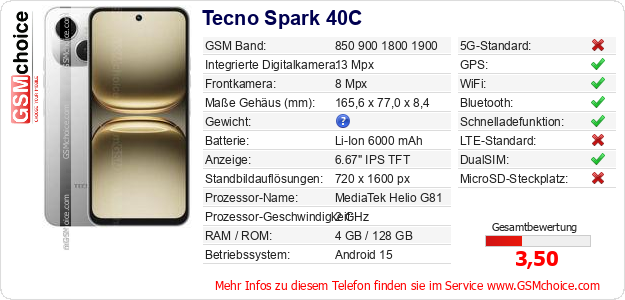 Hast du eigene Webseite? Willst du die Informationen über Standarddaten des Handys Tecno Spark 40C irgendwo veröffentlichen? Das ist sehr einfach. Du kannst das Bild herunterladen oder kopieren und auf der Webseite folgenden Code hinzufügen:Das Einfügen von diesem Code verursacht das Anzeigen von dem folgenden Bild: