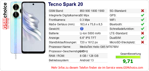 Hast du eigene Webseite? Willst du die Informationen über Standarddaten des Handys Tecno Spark 20 irgendwo veröffentlichen? Das ist sehr einfach. Du kannst das Bild herunterladen oder kopieren und auf der Webseite folgenden Code hinzufügen:Das Einfügen von diesem Code verursacht das Anzeigen von dem folgenden Bild: