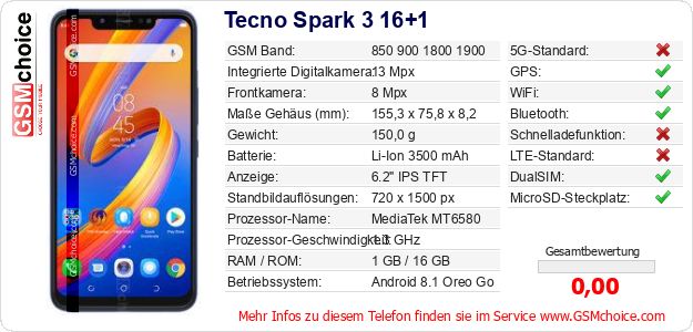 Hast du eigene Webseite? Willst du die Informationen über Standarddaten des Handys Tecno Spark 3 16+1 irgendwo veröffentlichen? Das ist sehr einfach. Du kannst das Bild herunterladen oder kopieren und auf der Webseite folgenden Code hinzufügen:Das Einfügen von diesem Code verursacht das Anzeigen von dem folgenden Bild: