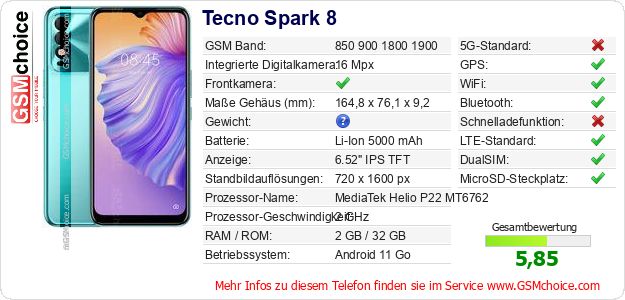Hast du eigene Webseite? Willst du die Informationen über Standarddaten des Handys Tecno Spark 8 irgendwo veröffentlichen? Das ist sehr einfach. Du kannst das Bild herunterladen oder kopieren und auf der Webseite folgenden Code hinzufügen:Das Einfügen von diesem Code verursacht das Anzeigen von dem folgenden Bild:
