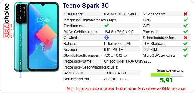 Hast du eigene Webseite? Willst du die Informationen über Standarddaten des Handys Tecno Spark 8C irgendwo veröffentlichen? Das ist sehr einfach. Du kannst das Bild herunterladen oder kopieren und auf der Webseite folgenden Code hinzufügen:Das Einfügen von diesem Code verursacht das Anzeigen von dem folgenden Bild: