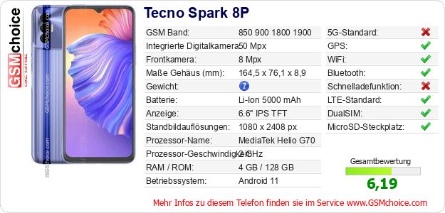 Hast du eigene Webseite? Willst du die Informationen über Standarddaten des Handys Tecno Spark 8P irgendwo veröffentlichen? Das ist sehr einfach. Du kannst das Bild herunterladen oder kopieren und auf der Webseite folgenden Code hinzufügen:Das Einfügen von diesem Code verursacht das Anzeigen von dem folgenden Bild: