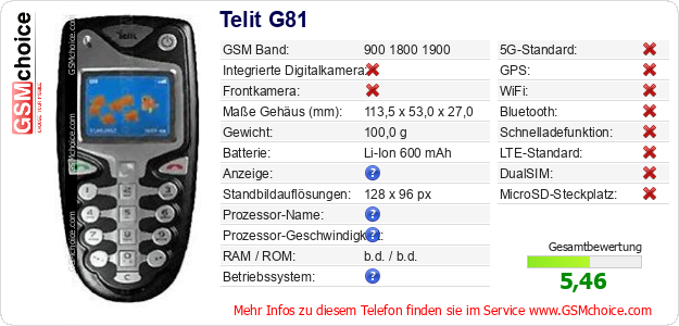 Hast du eigene Webseite? Willst du die Informationen über Standarddaten des Handys Telit G81 irgendwo veröffentlichen? Das ist sehr einfach. Du kannst das Bild herunterladen oder kopieren und auf der Webseite folgenden Code hinzufügen:Das Einfügen von diesem Code verursacht das Anzeigen von dem folgenden Bild:
