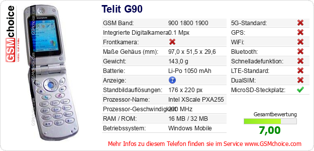 Hast du eigene Webseite? Willst du die Informationen über Standarddaten des Handys Telit G90 irgendwo veröffentlichen? Das ist sehr einfach. Du kannst das Bild herunterladen oder kopieren und auf der Webseite folgenden Code hinzufügen:Das Einfügen von diesem Code verursacht das Anzeigen von dem folgenden Bild: