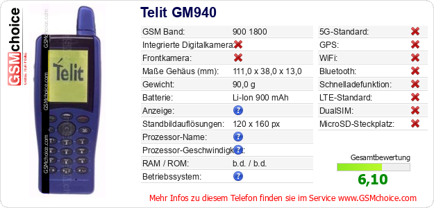 Hast du eigene Webseite? Willst du die Informationen über Standarddaten des Handys Telit GM940 irgendwo veröffentlichen? Das ist sehr einfach. Du kannst das Bild herunterladen oder kopieren und auf der Webseite folgenden Code hinzufügen:Das Einfügen von diesem Code verursacht das Anzeigen von dem folgenden Bild: