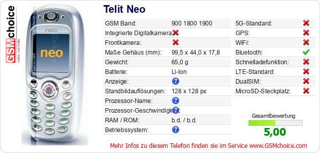 Hast du eigene Webseite? Willst du die Informationen über Standarddaten des Handys Telit Neo irgendwo veröffentlichen? Das ist sehr einfach. Du kannst das Bild herunterladen oder kopieren und auf der Webseite folgenden Code hinzufügen:Das Einfügen von diesem Code verursacht das Anzeigen von dem folgenden Bild: