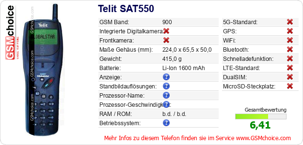 Hast du eigene Webseite? Willst du die Informationen über Standarddaten des Handys Telit SAT550 irgendwo veröffentlichen? Das ist sehr einfach. Du kannst das Bild herunterladen oder kopieren und auf der Webseite folgenden Code hinzufügen:Das Einfügen von diesem Code verursacht das Anzeigen von dem folgenden Bild: